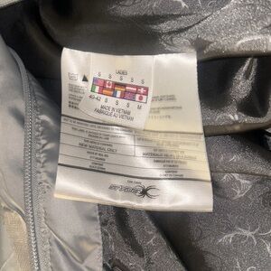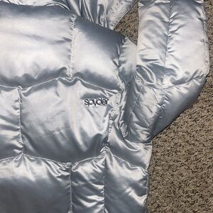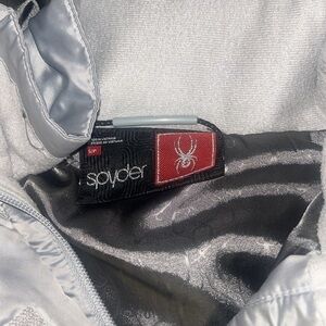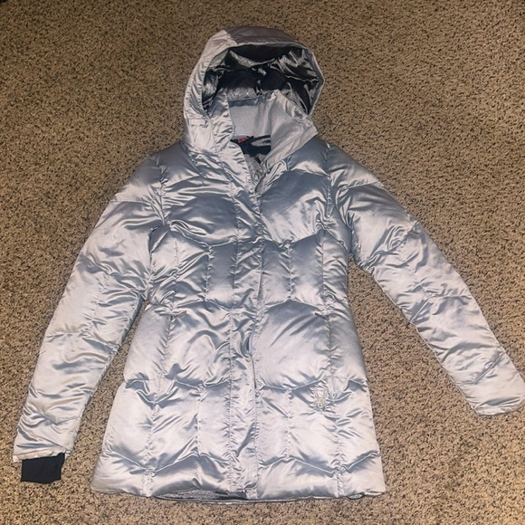 Spyder brand. Raven down ski coat. Silver color.Only issue is the zipper. Needs fixed. Other than the zipper it is in excellent condition. Originally $220.