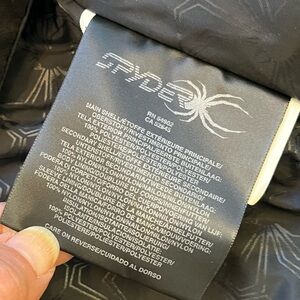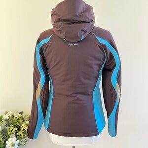 Spyder Brown and Electric Blue Ski Jacket. Zip and velcro closure, removable hood, adjustable cuffs, removable powder skirt, many pockets.