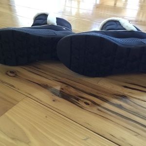 Black nylon (top), suede sides, rubber soles; white faux fur embellishments; great traction, great high quality brand, worn twice, excellent condition