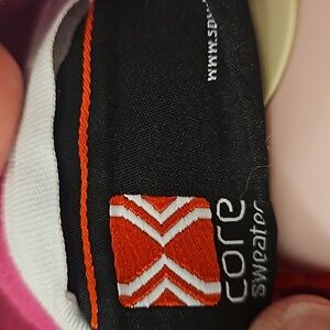 hot pink very fitted full zip jacket fleece lined. great layer for the slopes or even curling.