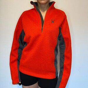 Spyder men's quarter-zip in the most vibrant red-orange you can imagine. In NEW condition originally $125. Made with Spyder's classic, high quality poly weave fabric. Size men's small. Shown on myself (I'm a size XS-S in women's). Purchased new, worn/washed only once. VERY soft on the inside and keeps you VERY cozy.
