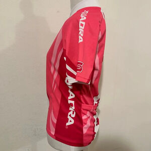 This women's Squadra cycling jersey is new with tags and in its original box. It features a pink and white design with the word "Squadra" vertically printed on the front and back. The jersey is made of a polyester blend, has short sleeves, a full-length zipper, and three rear pockets. Measurements: Length (collar to bottom hem) 23 inches, Width (armpit to armpit) 17 inches. The jersey shows no visible imperfections. The brand is Squadra. The size is Medium.