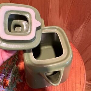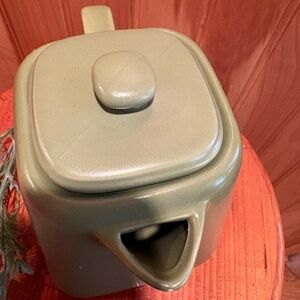 Starbucks 2012 Avocado Green Ceramic Square-Base Teapot. This teapot, with a 32oz capacity, features a retro design with a square base and a matte avocado green finish. It was produced in 2012 and is considered a collectible item by Starbucks enthusiasts and perfect for tea lovers.