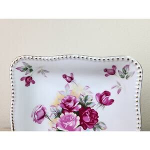 Square Bowl Floral Design Pink Roses 8 1/4" Porcelain Gold Trim Japan Vintage