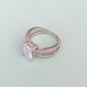 4 Prong accent ice solitaire ring .Featuring a large rectangular stone mounted on top with two rows of small crystals on each side. This makes the perfect engagement, wedding, promise, or cocktail ring.