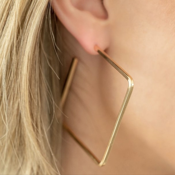 A deceptively simple square frame is tilted on point to create a geometric hoop. Its sharp angles are complemented by its rich gold finish, making a lasting impression. Earring attaches to a standard post fitting. Hoop measures approximately 2" in diameter.