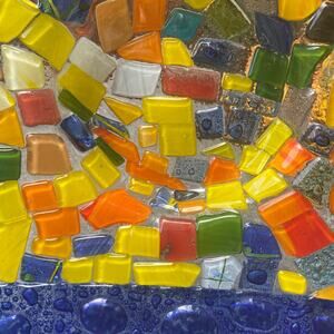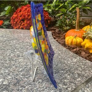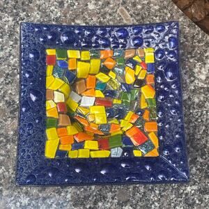 Square Fused Bubble Glass Cobalt Blue Multicolored Dish Tray 8” Art Glass Plate