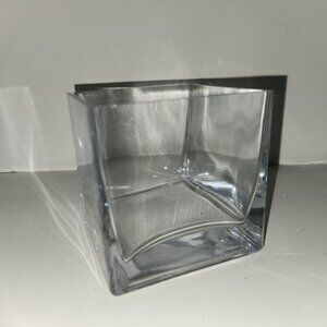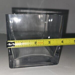 Pre-owned, in good condition, a few imperfections at top where glass is thinner. This is a small, heavy glass, square vase. *Sharp edges on top*. Approximate Measurements: 4"H x 4"W x 3"D. See Photos.