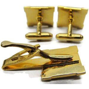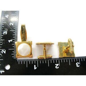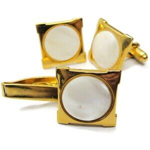 Square Gold-Tone & MOP Cufflinks Set w Tie Clasp Tux Shirt Dress Suit Vintage