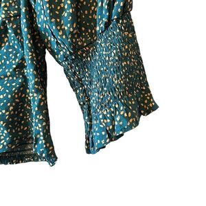 Square Neck 3/4 Sleeve Smocked Blouse Teal Gold Print Elegant Casual Top