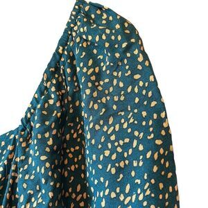 Romantic ruffles introduce a breezy peasant-chic blouse. A square neckline elegantly frames your face, while the 3/4 sleeves with smocked cuffs add a touch of bohemian flair. The teal backdrop is splashed with a subtle gold print, creating a versatile piece for both daytime charm and evening elegance. Picture yourself wearing this top to a weekend brunch, a casual office gathering, or a garden party.