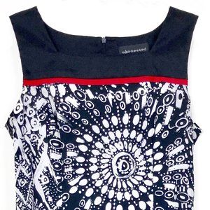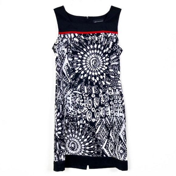 Sleeveless Square Neck Graphic Pattern Black & White Above Knee Dress wt Red Accent. Zippered back with vent extension at hem. Perfect for summer.