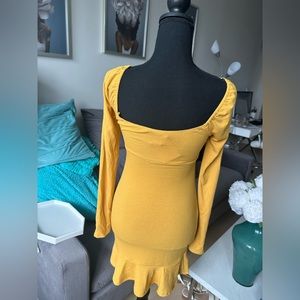 New with tags and never worn. Form fitting with beautiful diagonal ruffle detail on the skirt.