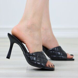 Square Open Toe High Heel Sandal Black Heeled Quilted Slip On Mule