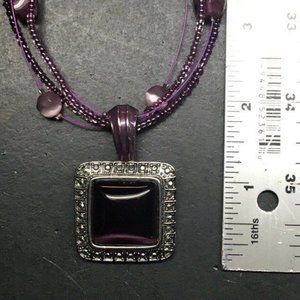 Beautiful detailed pendant with silvertone edge square with dark purple center, multi strand purple beaded (faceted, round, transluscent...etc.) necklace!