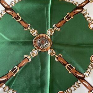 I doubt it’s real silk but it’s pretty durable and chic! New, no damage apart from some small imperfections from the ink due to the manufacturer’s printing. Still has creases from when it was originally packed. Unknown brand.