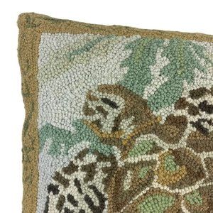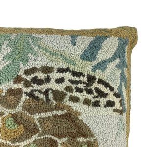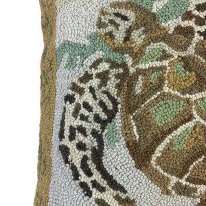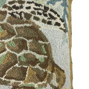 Square wool rug top throw pillow. Top features a swimming sea turtle. Measures approx 17"x17". Back zipper.