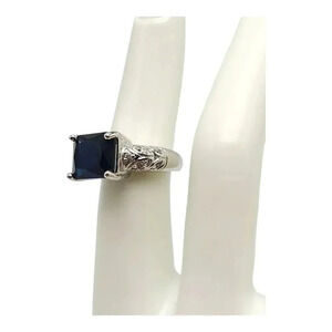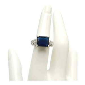 Square Shape Blue Faceted Crystal Victorian Style Ring Silver Tone Vintage Size6