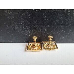 These are a vintage pair of square shaped gold tone metal screwback earrings with clear rhinestones.