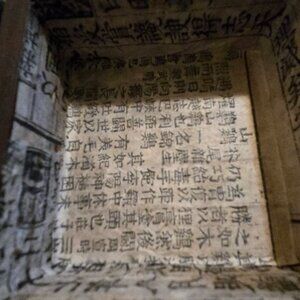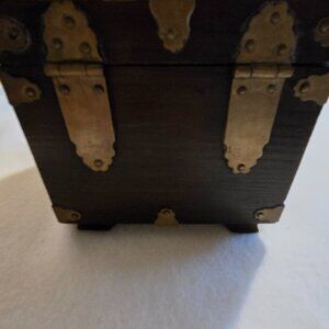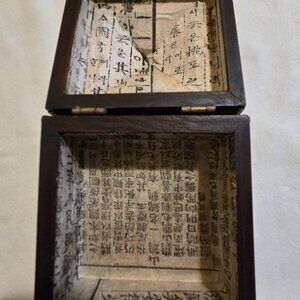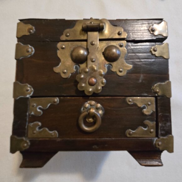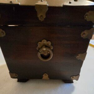 Square Korean Prayer Box 6 1/2", Vintage Reproduction Wood Brass Footed Box, Brass Scroll Accent Decorative Box 1 Drawer. pre-Owner. Used. in good condition inside. in excellent condition outside