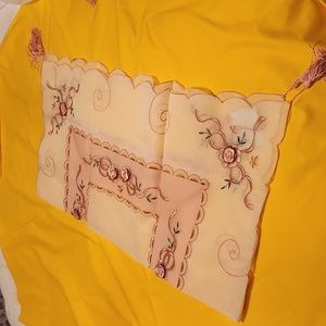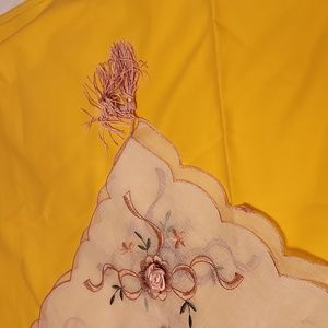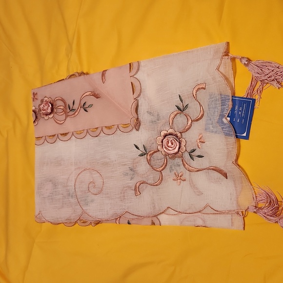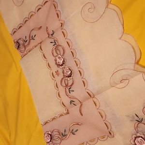 Table Linen/Topper, sheer, polyester, measures 36" square. Beautiful off-white background with pink/burgundy/green embroidery and ribbon applique roses. scalloped edges and tassels on corners. Please see pictures.