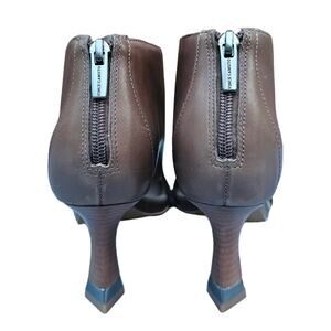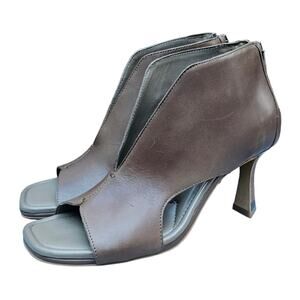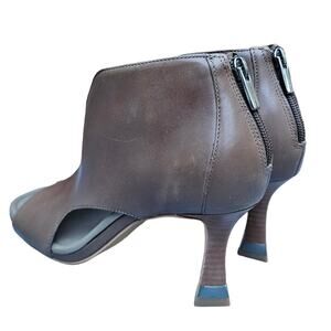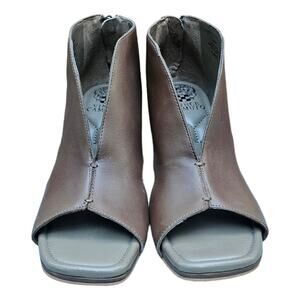 Brown leather upper, split v-notch vamp, cutouts on sides. Rear zip, square open toe, triangle shaped heel w/ metal wrap accent. Issues noted in photos. Very good preowned condition, overall. Size 7.5M by Vince Camuto. Style: Jesilia.