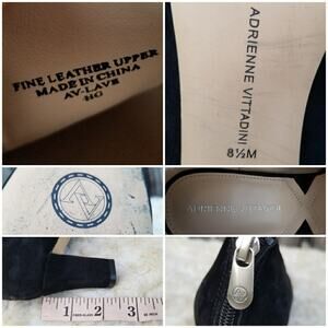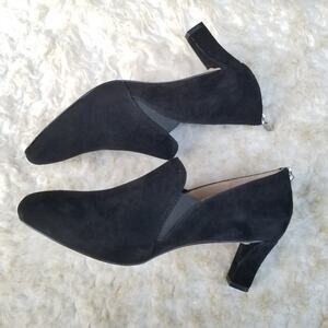 Black sueded leather upper, square toe chunky suede covered heel. Rear silver tone zipper, stretch gore panels on sides for comfort. Issues noted in photos. Excellent preowned condition, overall. Size 8.5 M by Adrienne Vittadini. Style: Lave