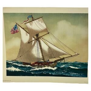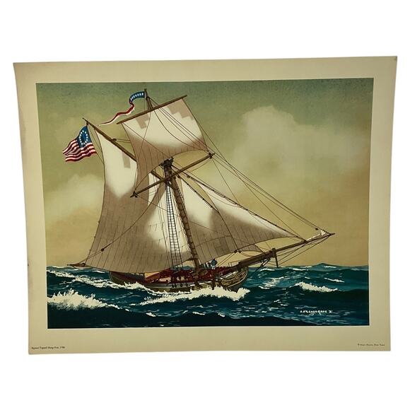 This stunning nautical art print depicts the Square Topsail Sloop "Fox" as it sailed in 1780. Painted by maritime artist J.O.H. Cosgrave II and published by Penn Prints in New York, this piece captures the essence of early American naval design.