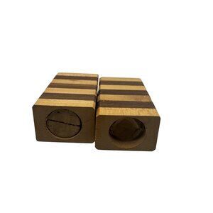 Crafted from wood with a striped pattern, this salt and pepper shaker set blends functionality with rustic charm, ideal for kitchen or dining decor.