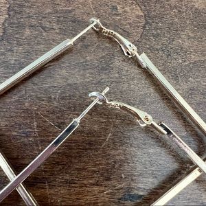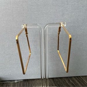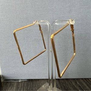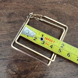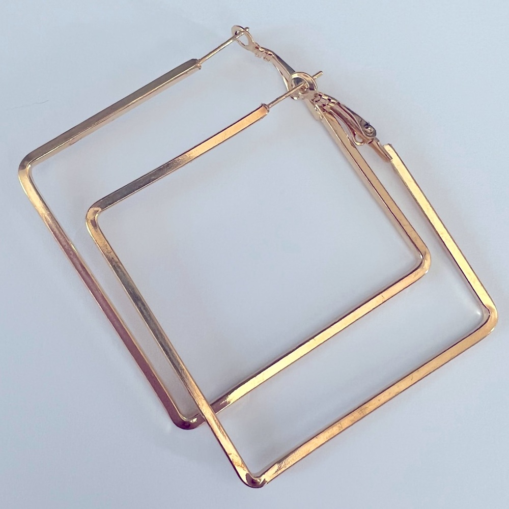 These square hoops are done in gold tone metal. Lightweight, but still too large for me. Worn a handful of times.