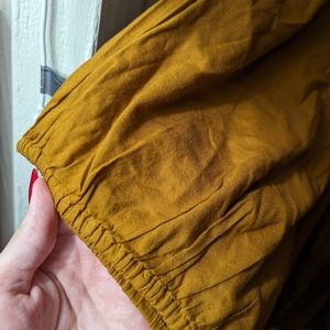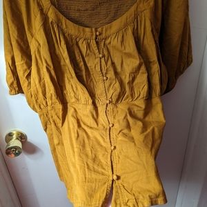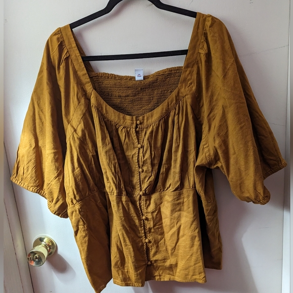 Square neck, peplum, burnt orange/mustard, full button front, blouse