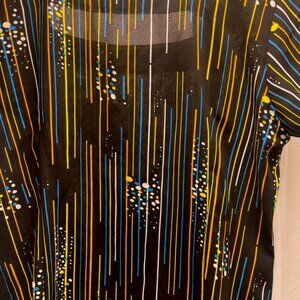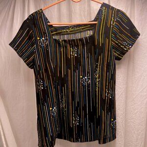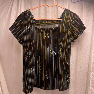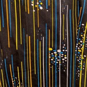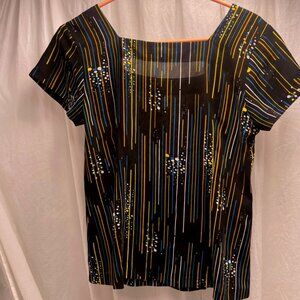 Elevate your wardrobe with this sophisticated square neck vintage blouse for women in a versatile medium size. Designed with a modern flair, the blouse features a striking black base adorned with an eye-catching pattern of vertical stripes and splatter accents in vibrant hues of yellow and blue, creating a dynamic contrast that's sure to turn heads. The square neckline offers a touch of elegance, making it an excellent choice for both casual and more dressed-up occasions. Short sleeves add a sense of ease and comfort, perfect for the warmer seasons or layering under a jacket. Whether styled with a pair of sleek trousers for a day at the office or paired with your favorite jeans for a weekend outing, this blouse is a versatile addition to any fashion-conscious individual's collection.