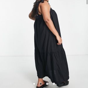 Square neck tie strap tiered midi dress in black