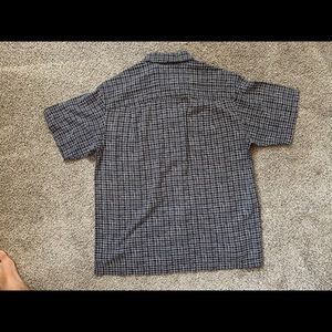 Really flattering button down. Comfortable fitted cut with really soft fabric. Cool pattern as well. Size Medium and fits true to that. Good length for tucking or leaving untucked. No damage.