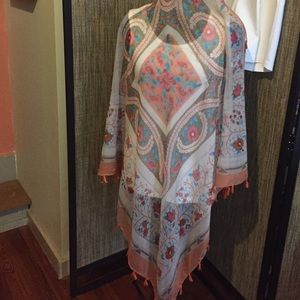 Large square scarf with center pattern and tassel trim. Second pic shows the printed pattern. Orange/melon, pink, teal, khaki, and cream. Lightweight. So stylish! (36" square)