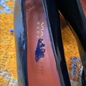 Go back in time with these squared off black leather pumps. Lots of scuffing but nothing a little shine won’t help. Made in Italy.