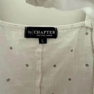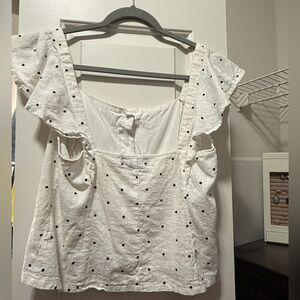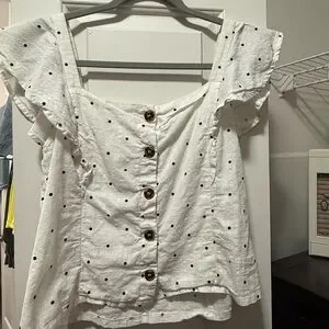 Gently used, white with small black polka dots, button up front, square neckline and back line, ruffle sleeves, Size Large