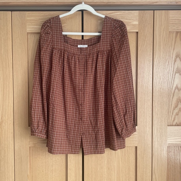 Lightweight rust plaid button-down blouse with a flattering square neckline. Soft, relaxed fit with full sleeves and subtle gathers for easy movement. Versatile rust color that pairs well with jeans or skirts for everyday wear.