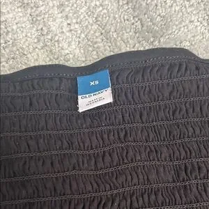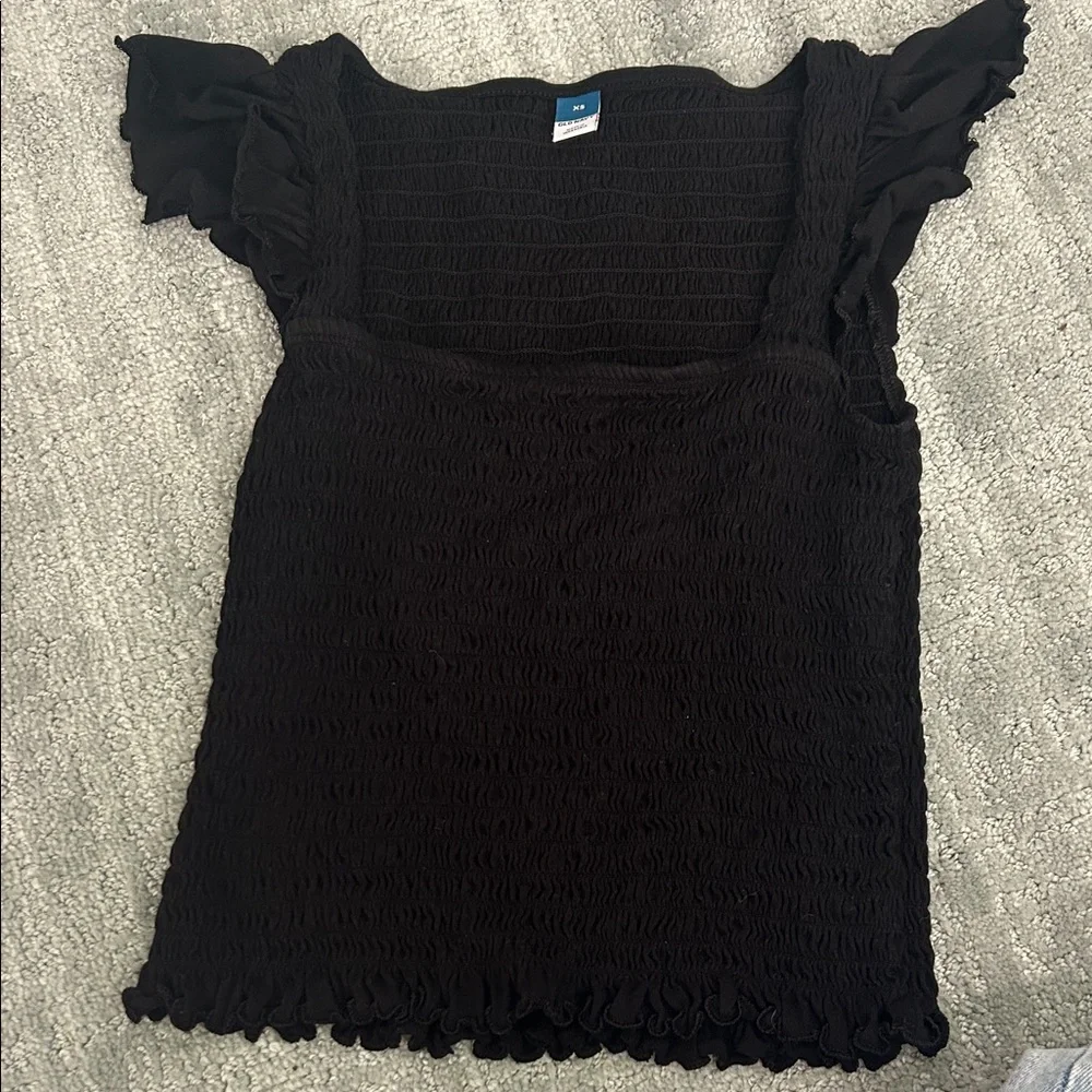 This is a stretchy material with cute ruffled sleeves. It is a scoopneck and has a very small cute ruffling at the bottom of the shirt