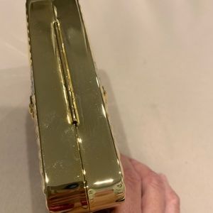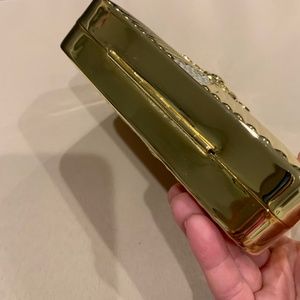 This gorgeous shiny Goldtone metallic evening bag is designed w/rhinestones and a floral embossed design on the front and back. It is in excellent, like new condition. It measures 5 3/4”L x 4 1/4” W. The inside is lined with a black, velvety lined fabric. It has an 18” L Goldtone rope chain shoulder strap. This bag can be worn on the shoulder or handheld as appropriate to your needs. Closure works great!