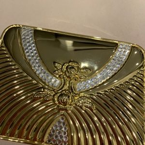 Square-Shaped Goldtone Metallic Evening Bag w/ Rhinestones and Floral Embossed
