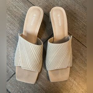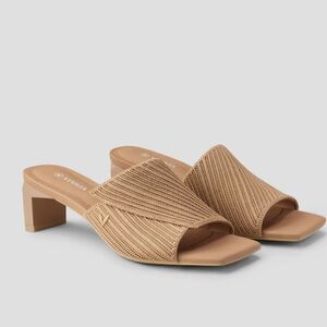 Square-Toe Block Heel Slides (the Jade style) by Vivaia. Almond color.