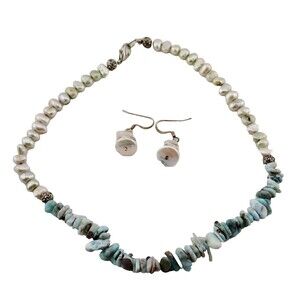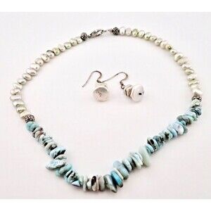 Squashed Pearl Blue Shell Beaded Chocker Necklace & Matching Hook Earring Set