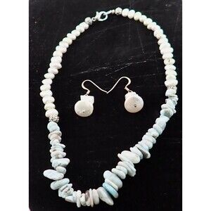Squashed Faux Pearl Blue Shell Beaded Necklace & Matching Hook Drop Earring Set