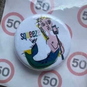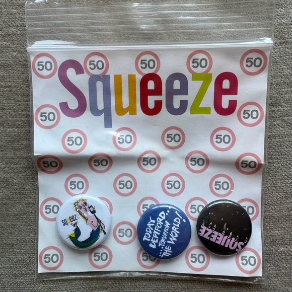 Set of three colorful Squeeze button pins. Features unique designs and vibrant colors.