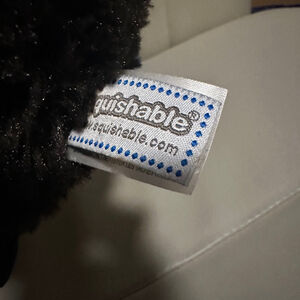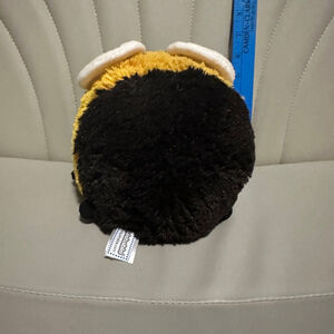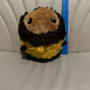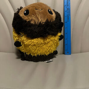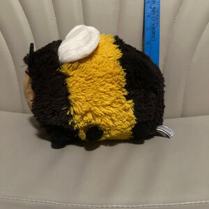 This is a pre-owned Squishable brand plush toy, resembling a bee. It features a round body with yellow and black stripes, a brown face, and small black appendages. The toy has white wings attached to the back. The material appears to be a soft, plush fabric. The toy measures approximately 7 inches in height. There are no visible stains or tears.