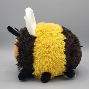 Plush Squishable bumblebee toy that is round with brown and yellow stripes. The bumble bee also has white ears and six plush legs. This stuffed animal was made in 2020 of polyester fibers and is intended for ages 3 years and older. It measures approximately 7" long.