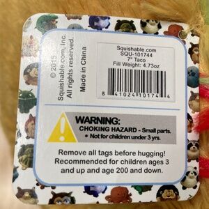 Official Squishable Description: Tacos! "The best transportation option to get seasoned meat from your plate to your face! They're a perfect model of one-handed noshing efficiency: unlike arepas, empanadas and pupusas, you know exactly what you're getting before the first bite! With this Taco, what you're getting is cuteness, softness and joy. Hug a Taco! Yeah! We guarantee the filling won't fall out the back!"