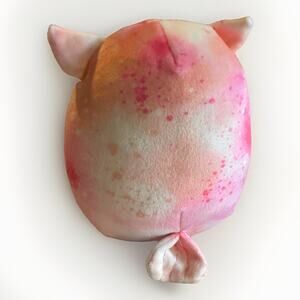 Olalla is a pink, tie-dyed owl with shades ranging from hot pink to coral to blush, as well as a paint splatter pattern on top. She has white patches surrounding each eye which are edged with rows of white and pink feathers. She also has a white belly with three rows of feathers outlined in pink. She has a gold beak and round, black eyes with curled lashes. Her tag does have initials on it.
