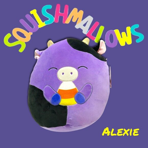 Squishmallow Alexie Purple Black Cow Holding Candy Corn 14 Inch Halloween Plush! NEW! NWT!